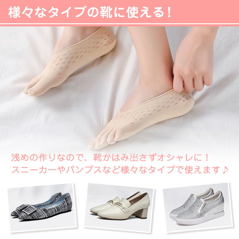 5本指ソックス(3足セット) 指にしっかりフィットする五本指デザイン! 指先1本1本に力がしっかりと入ることでバランスが良くなりスタイル効果も期待! 浅めで靴から靴下が見えにくく、スニーカーやパンプスなど様々なタイプに最適! 通気性が良く快適な履き心地! 蒸れがちな足先もしっかりと吸収し気になる臭いも予防! かかと部分はズレ防止の滑り止めラバー付きで歩行時に脱げるストレスを軽減! ■カラー:ホワイト、グレー、ブラック、ピンク、ベージュ ■サイズ:22.5〜26cm ※メール便(ネコポス・送料無料・最短翌日お届け)での発送となります。